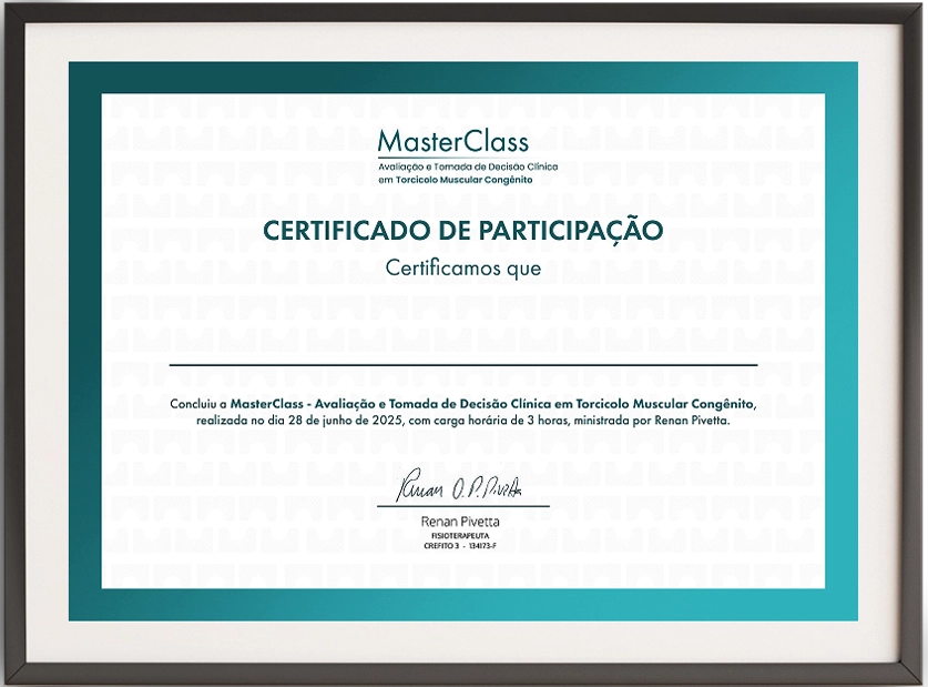 Ao concluir a MasterClass, você receberá um certificado exclusivo, que comprova seu comprometimento com o aprimoramento na avaliação e tomada de decisão clínica em TMC — um reconhecimento importante na sua trajetória profissional.